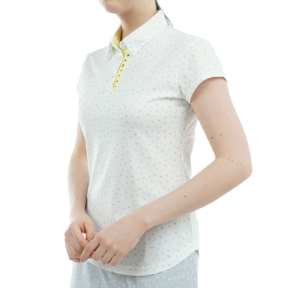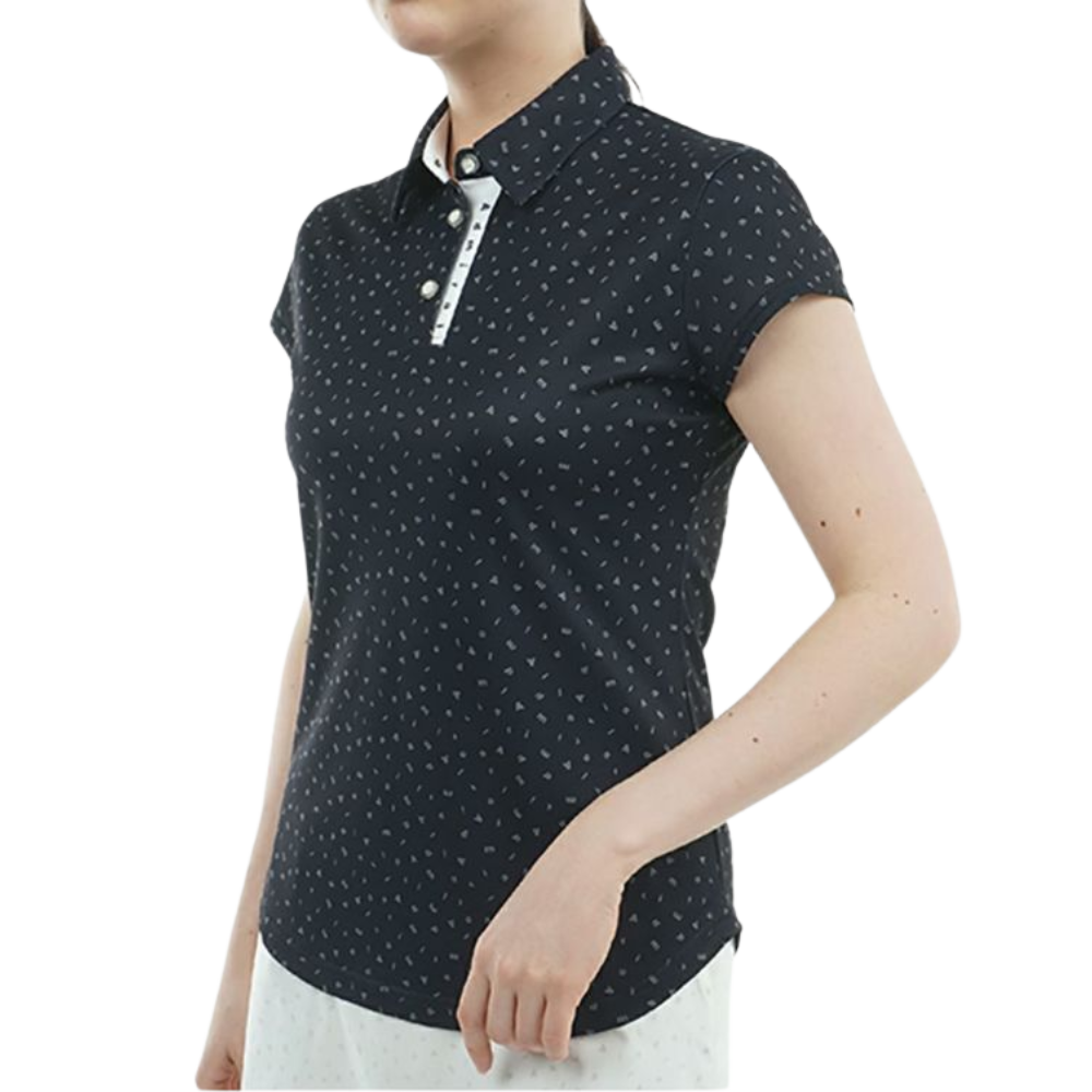 A polo shirt made of [sparse] material that quickly absorbs sweat and quickly transpires. It features a dancing logo print with a random sprinkling of brand initials. Shorter cap sleeves and round hem cut create a feminine silhouette. The color scheme at the collar, the logo, and the candy-like clear glame buttons accentuate the design. It also has stretch properties and provides a comfortable fit.